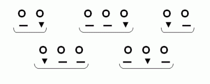 Para graficar estos conceptos, que como se postula en 3.2 se pueden aplicar a distintas disciplinas artísticas, en la siguiente exposición se van a emplear signos convencionales arbitrarios. Para indicar un acontecimiento cualquiera, como por ejemplo notas, sílabas o movimientos del cuerpo se va a utilizar el símbolo О, para indicar una parte acentuada o fuerte ▼, y para una parte no acentuada o débil ▬. De manera que los cinco grupos básicos DF, DDF, FD, FDD y DFD se pueden graficar así respectivamente :