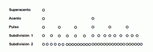 La elección del nivel al que se llama pulso depende del contexto en que se presente la estructura métrica, lo que no se representa en este gráfico. Muy frecuentemente en el transcurso de una obra musical o coreográfica el pulso se transforma en subdivisión, luego en pulso, luego en acento sucesivamente y normalmente este hecho no se refleja en la escritura ni se explicita de ninguna manera. Nótese que si se denomina pulso al nivel que en el primer gráfico está llamado acento y se suprime es segundo superacento, el compás se transforma en uno de cuatro partes con tres niveles de subdivisión.