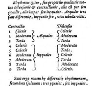 The second difference was more important. Since they were using the metric poetic system, the ancient physicians had at their disposal a quite limited notation tool that allowed to note only four proportions based on 1 (◡ ) and 2 times (◡ ◡ or –). The new musical notation was much more versatile and precise since it allowed to combine four different kinds of time-lengths: minima (½ time); semibrevis (1 time); brevis (2 times); longa (4 times), making up at least 64 possible rhythms.