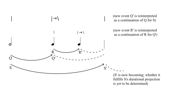 Second events can also behave as continuations that “will participate in the becoming of an event previously begun” (104). The first event is past, but “present” in its implications for the becoming of the new event. Continuation signifies a decision not to think of the new event as a new beginning, and therefore not to make the first event past. In the example below (following Hasty’s Example 9.5, p. 109), there is a new event at “R” (giving durational determinacy to the first event, which is then projected as durational potential onto the new event), but if we choose to interpret (that is, if there is some phenomenological reason for choosing to interpret) the new event as a continuation, then multiple strata of projective activity result.