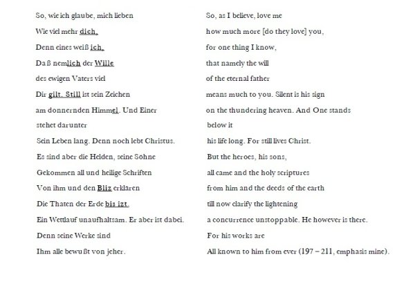 Although a general movement in the poem might be traced from Greek to modern tendencies this movement is already visible in the “journey” of the speaker to “Patmos” at the start of the poem. The nearness of the god coincides with the difficulty of “grasping” (fassen) him, which gives way to a “Geschick” or “fate” in the most literal sense – toward the island of “Patmos” itself. (The words for “fate” in German (Geschick, Schicksal) have everything to do with sending, having been sent (schicken, geschickt worden sein) ; thus it is overdetermined when the fate of the speaker is a journey. He is, to be more exact, “sent” geschickt on his journey, insofar as a “genius” Genius (19) drives him from his home and thus dispatches him elsewhere.) To sum up ; Touching one tendency in words propels the speaker of Patmos in a different direction ; measures shift, as does the very shape of the “Gott,” who reechoes now as the “Grotte.” From the one who might be (with difficulty) grasped, he becomes the place to which one is propelled.